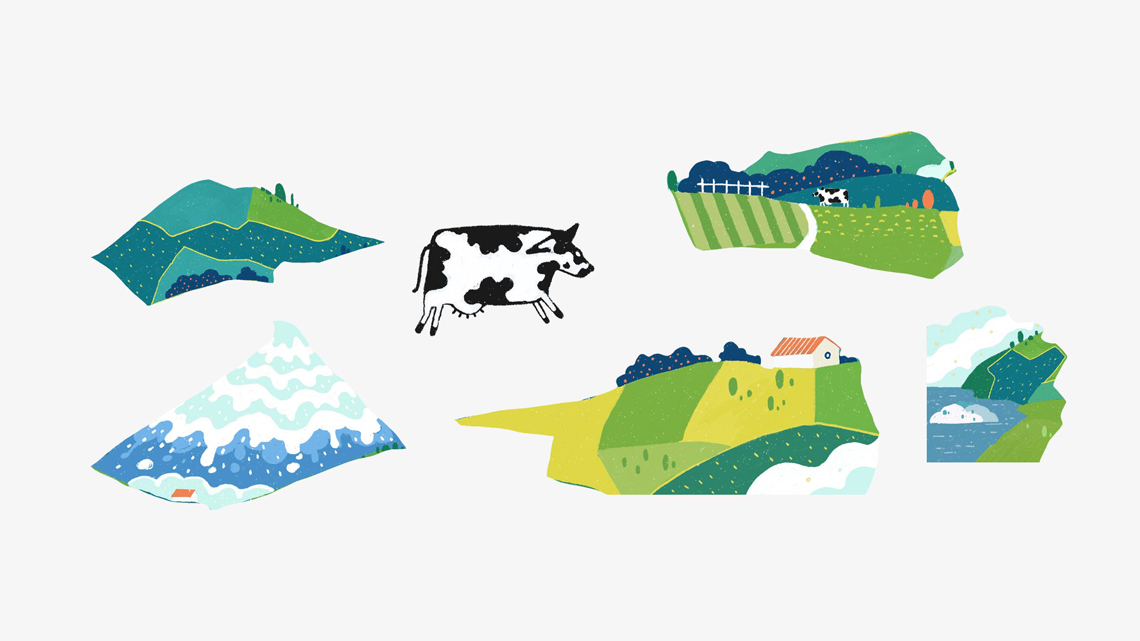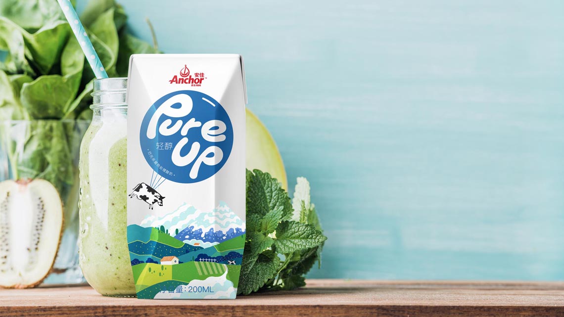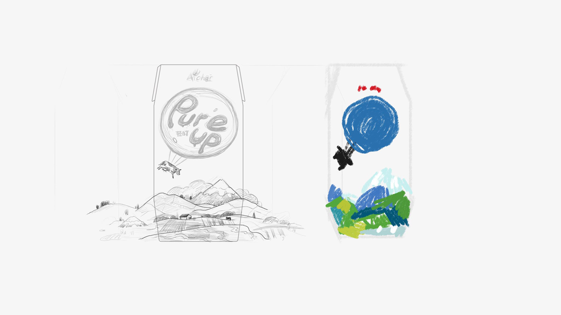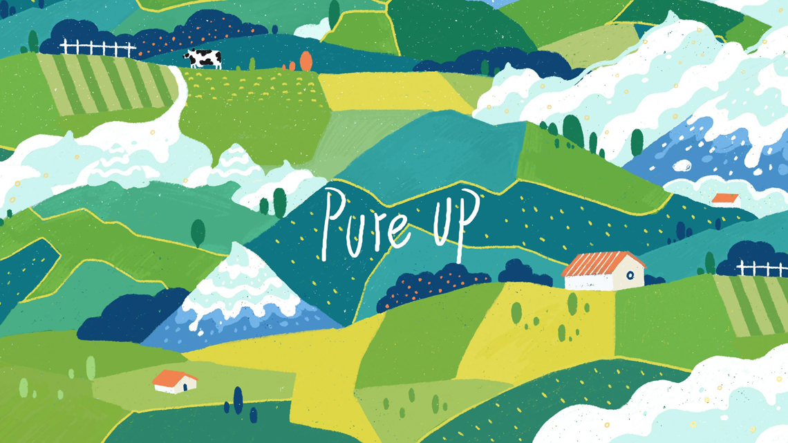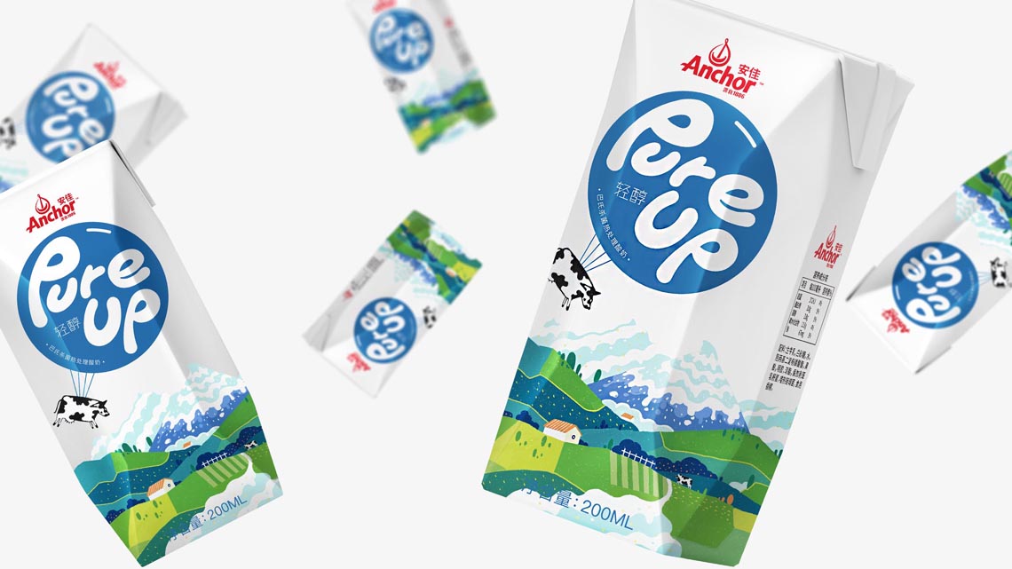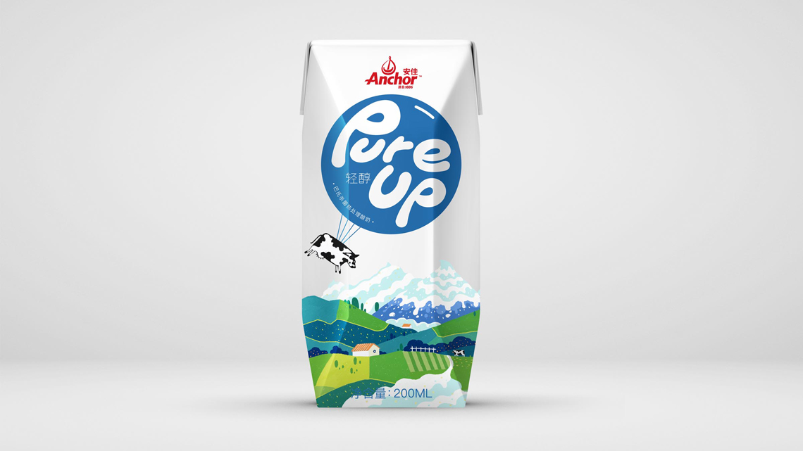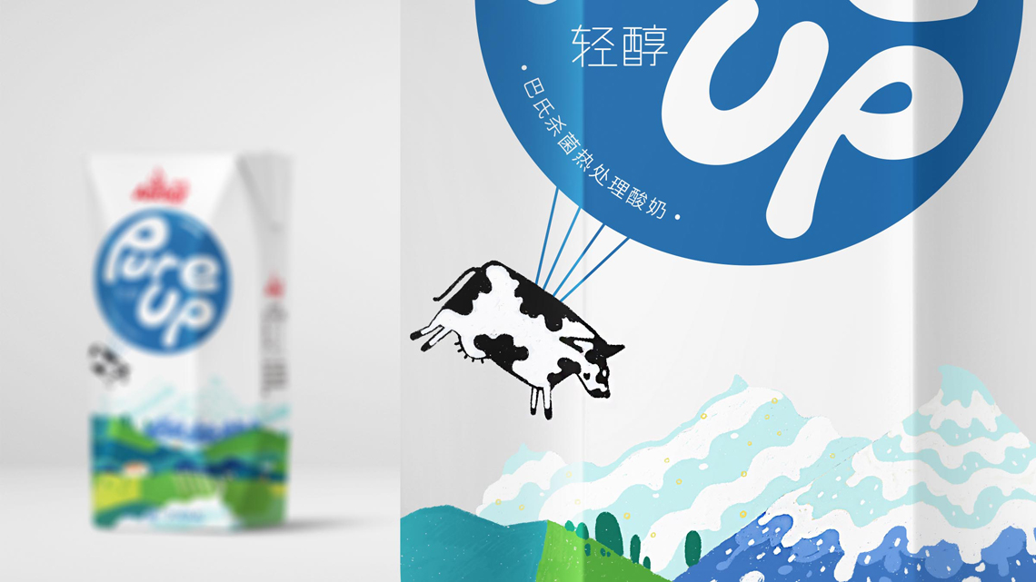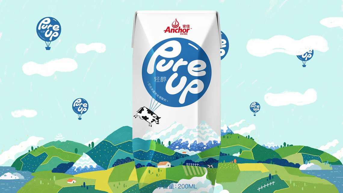 Pure Up輕醇酸奶, 這是安佳旗下的一款酸奶。它來自新西蘭,沒看錯。我們把這頭奶牛掛在氣球上了,開始從牧場起飛,離開它的家鄉(xiāng),把奶帶到世界各地。我們把酸奶雪山變?nèi)诨? 描繪了牧場草地不同的色彩組合, 而標識融入在氣球中格外顯眼, 讓整體畫面?zhèn)鬟f出濃濃自然的“奶味“, 讓消費者感受到我們酸奶的自然。