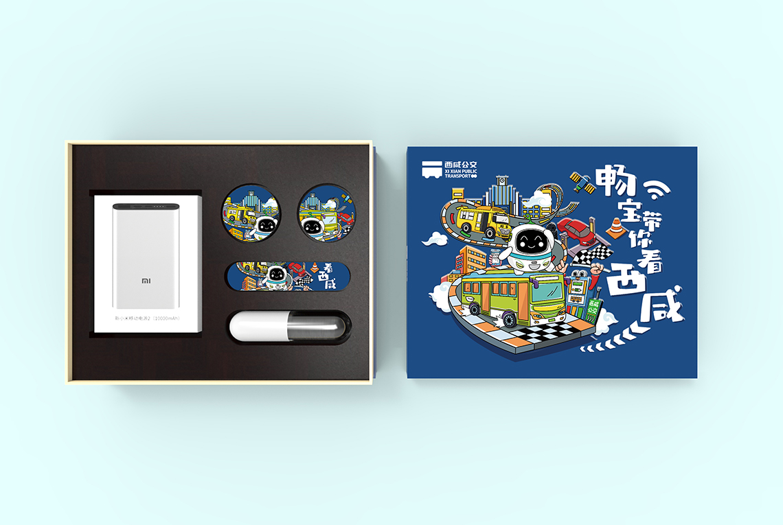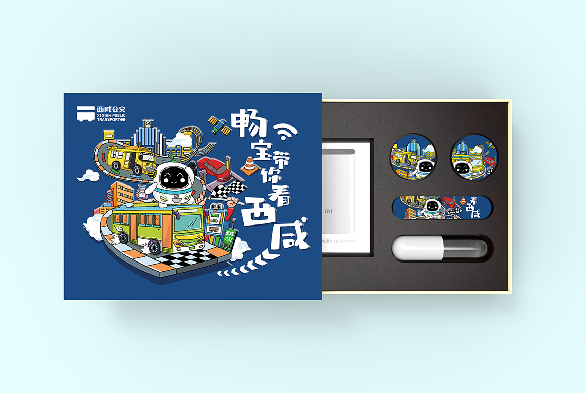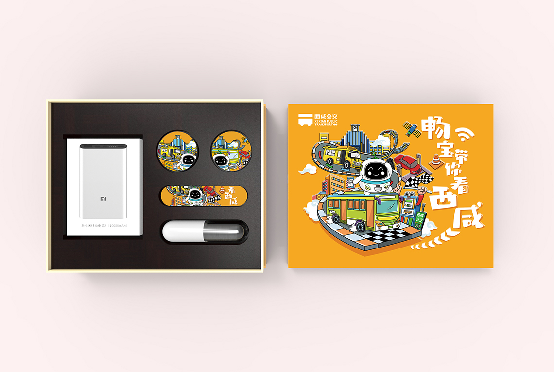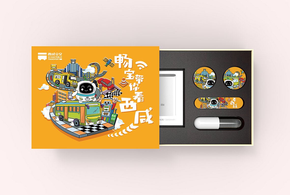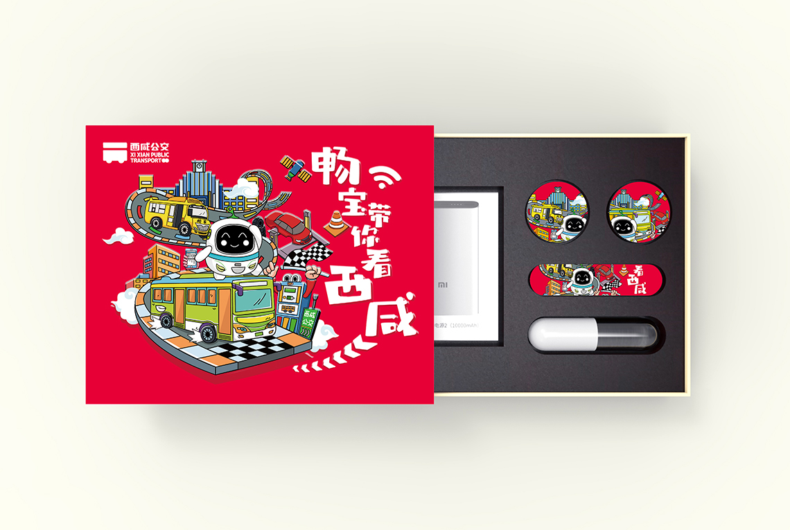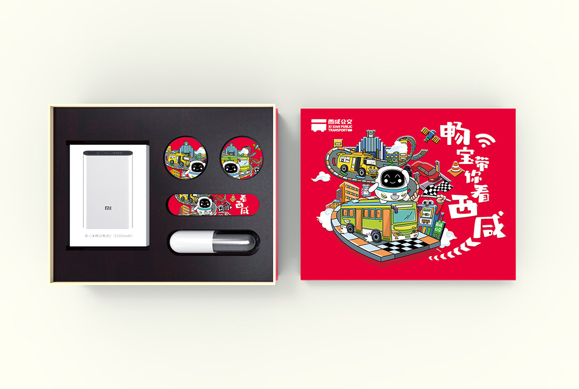 年輕、有趣的插畫形式,個性的構(gòu)圖方法,使畫面靈動有趣,包裝中的每一個元素和細節(jié)都富有西咸公交的特色,在傳遞企業(yè)服務理念的同時也不失樂趣。